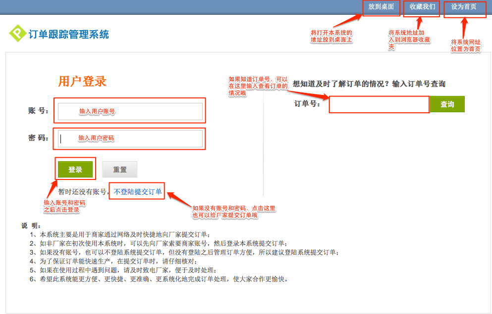 本系统主要是用于商家通过网络及时快捷地向厂家提交订单。厂家登录系统之后,就能直接打印出商家提交的订单,迅速安排生产,并能通过系统向商家反映订单状态。商家可以通过订单号查询,随时关注订单的状态信息。